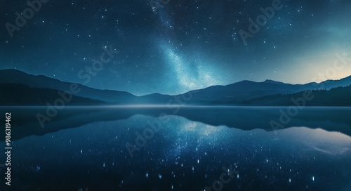 Fototapeta premium Serene night over the calm lake reflecting a starry sky and distant mountain...