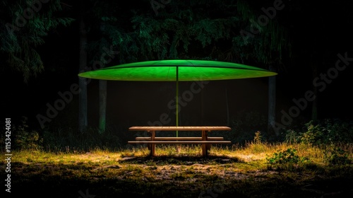 Naklejka premium Serene Night Picnic Wooden Table Green Umbrella Forest