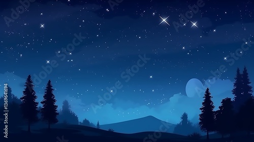 © Bubur, Naklejka premium Serene Night Scene with Silhouetted Trees and Stars