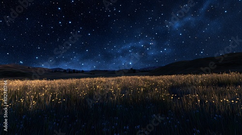 Fototapeta premium Serene night sky over a field with twinkling stars.