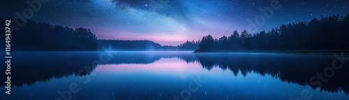 Fototapeta premium Serene Night Sky Reflecting Over Calm Lake Surrounded by Forest