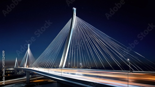 © WS Studio 1985, Obraz premium Serene Night View of Bridge with Light Streaks and Traffic Flow
