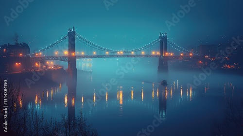 © sandi, Naklejka premium Serene night view of illuminated bridge over misty river with reflections