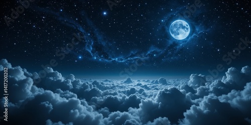 © Tanish, Obraz premium Serene Nightscape: Full Moon over Cloud Sea
