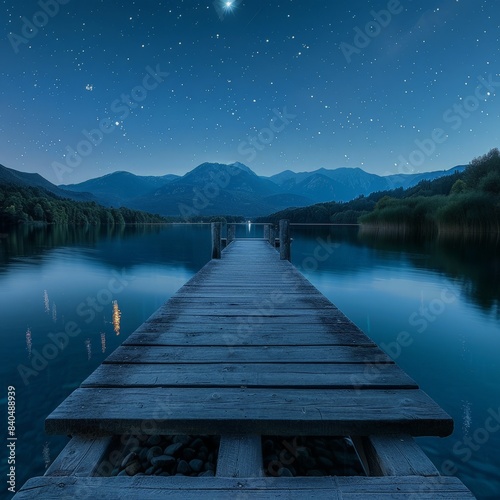 Naklejka premium Serene Nightscape: Wooden Pier over Still Lake, Surrounded by Mountains,...