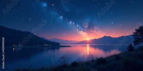 Obraz premium Serene nocturnal view with shimmering stars and twinkling bokeh lights,...
