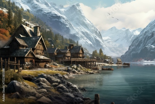 Fototapeta premium Serene Nordic village view. Scenic snow. Generate Ai