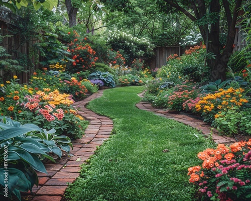 Naklejka premium Serene Oasis in Bloom - Stunning Full-Frame Shot of Lush Backyard Garden with...