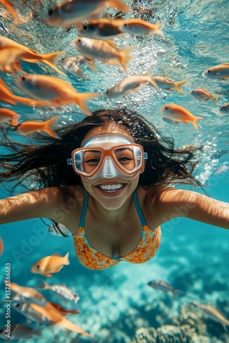 © G - Sto Xet, Fototapeta premium Serene ocean escape. A dense school of silver fish swims next to her. A lovely and sexy happy mixed-race young woman with black hair in a swimming mask and fins snorkeling among the corals.