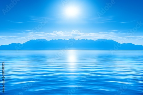 © fgdr, Obraz premium Serene ocean landscape with sun reflecting on calm water and distant mountains.