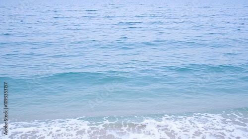 Fototapeta premium Serene ocean scene featuring a vast expanse of blue water with gentle waves lapping against the shore creating a foamy edge, beach shoreline, blue ocean, reflective surface