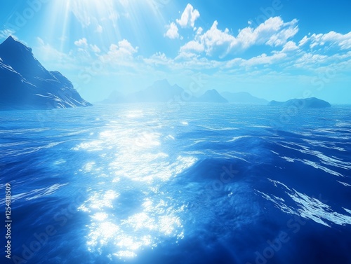 © afterfast, Fototapeta premium Serene ocean scene with sunlit mountains and clouds.