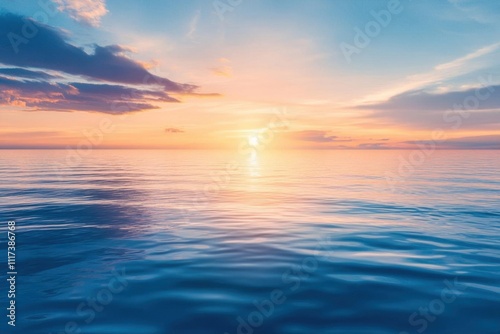 © Shofiyana, Obraz premium Serene ocean view at sunset, showcasing calm waters and vibrant sky.