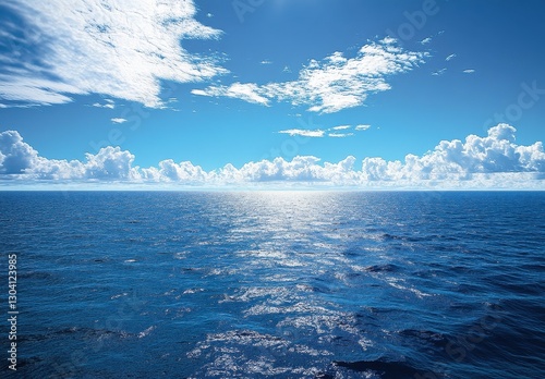 Obraz premium Serene Ocean View Under Bright Sky with Soft Clouds and Gentle Waves Reflecting Sunlight in a Tropical Paradise Setting