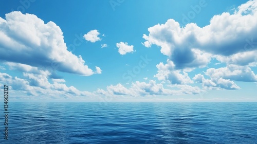 © luru, Obraz premium Serene ocean view with fluffy white clouds against a clear blue sky