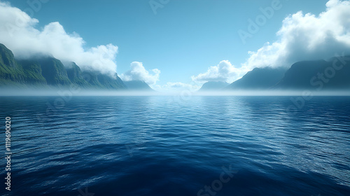 © Titin, Naklejka premium Serene ocean view with misty mountains.