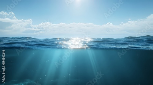 © QITIAN, Fototapeta premium Serene ocean view with shimmering sunlight reflecting on water surface.