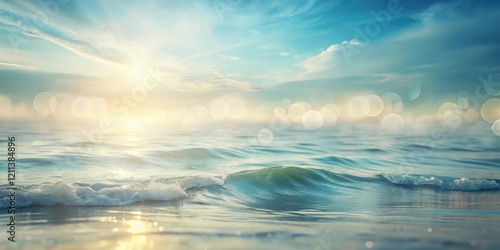 Obraz premium Serene ocean waves gently lapping the shore at sunset, illuminated by warm golden light and soft bokeh effects