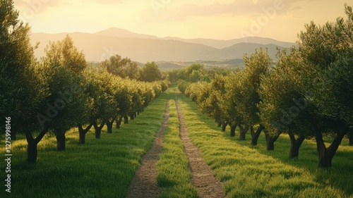 Naklejka premium Serene Olive Grove Landscape Sunset Path and Rolling Hills