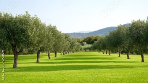 Naklejka premium Serene olive grove with lush grass and distant hills.