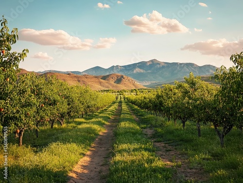 © ANUAR, Fototapeta premium Serene Orchard Landscape at Sunset with Green Rows of Trees and Majestic Mountains in the Background Under Cloudy Sky