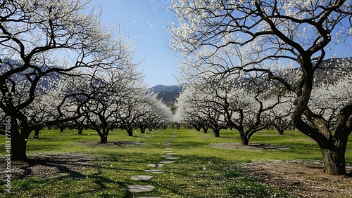 © Subrata, Fototapeta premium Serene Orchard Pathway Lined with Blooming White Cherry Blossom Trees
