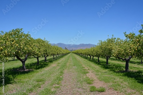 © CogniLens, Naklejka premium Serene orchard with blossoming fruit trees and a clear sky.