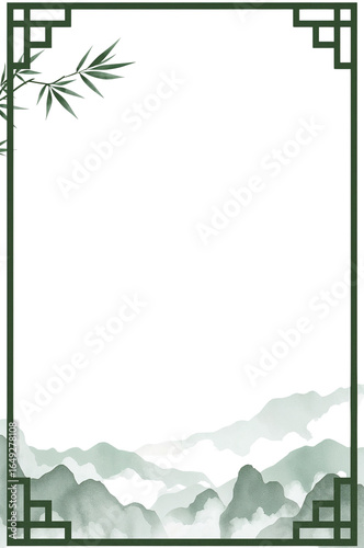 Obraz premium Serene oriental design featuring misty mountains and bamboo against an empty...