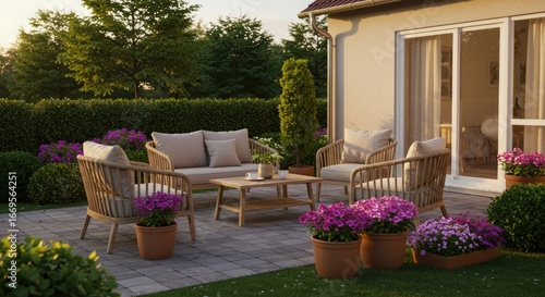 © awik, Fototapeta premium Serene Outdoor Patio with Wicker Furniture and Vibrant Pink Flowers at Sunset