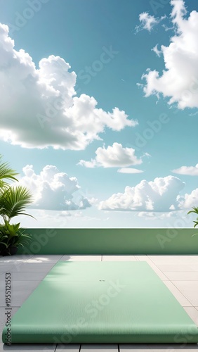 Naklejka premium Serene Outdoor Yoga Mat Setup Under A Bright Blue Sky With Fluffy Clouds