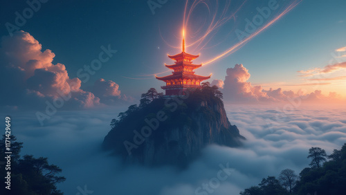 Obraz premium Serene Pagoda Above Cloudscape - Mystical and ethereal landscapes