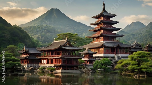 Fototapeta premium Serene Pagoda Landscape Amidst Lush Green Mountains