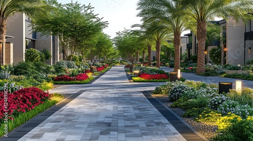 Fototapeta premium Serene Palm-Lined Pathway in a Modern Residential Development