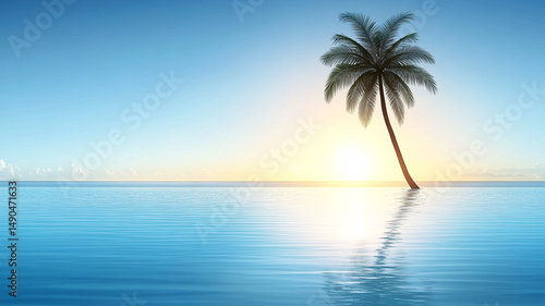 Obraz premium serene palm tree stands alone by tranquil ocean at sunrise, creating peaceful...