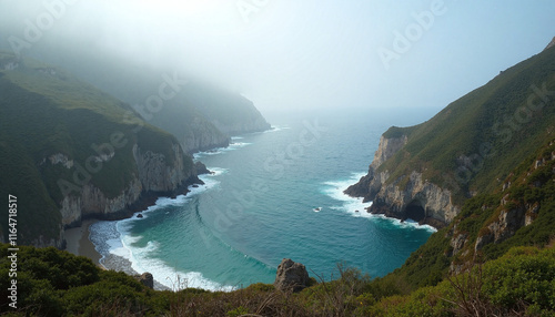 © Yury, Fototapeta premium Serene panoramic cove surrounded by dramatic cliffs and lush vegetation with soft fog creating a mystical atmosphere, vibrant blue waters gently lapping at the shore