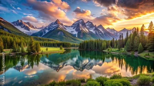 © Sirinporn, Fototapeta premium Serene panoramic view of a majestic mountain range with snow-capped peaks, lush green valleys, and a tranquil lake in the foreground at sunset.