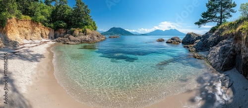 Obraz premium Serene panoramic view of a tranquil beach with crystal clear waters and lush...