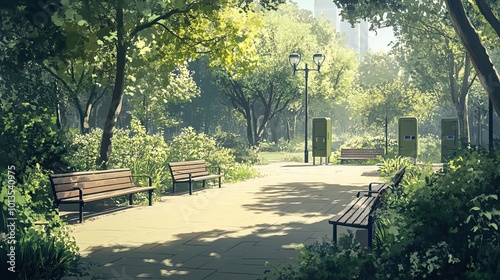 Obraz premium Serene park features integrated travel lockers within benches for convenience...