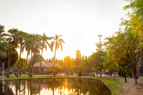 © Chawich, Obraz premium serene park in city center during sunrise time