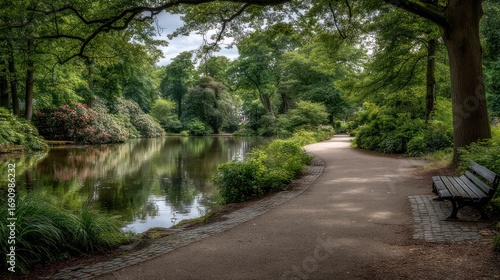 Fototapeta premium Serene park path, reflecting pond, lush greenery