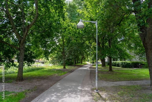 Obraz premium Serene park pathway lined with lush green trees under a bright sky in Uppsala, Sweden
