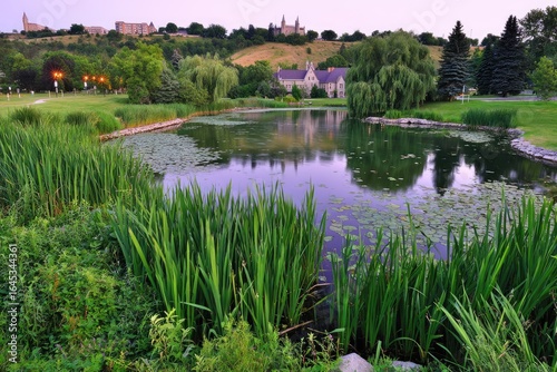 © Space, Naklejka premium Serene park pond at dusk, with reflections of hills and buildings