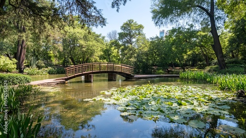 Fototapeta premium Serene park scene with wooden bridge over tranquil pond, lush greenery, and water lilies