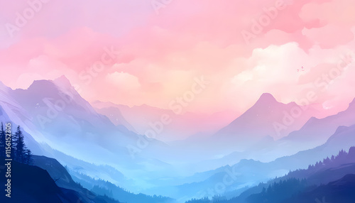 © JOY, Obraz premium Serene Pastel Mountainscape Under a Soft Pink Sky