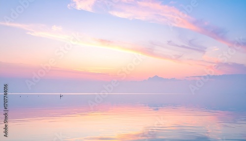 © Hadi, Fototapeta premium Serene pastel sunrise over calm water reflecting the soft sky and clouds.
