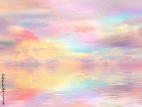 Obraz premium Serene pastel sunset over calm waters reflecting colorful clouds in a...