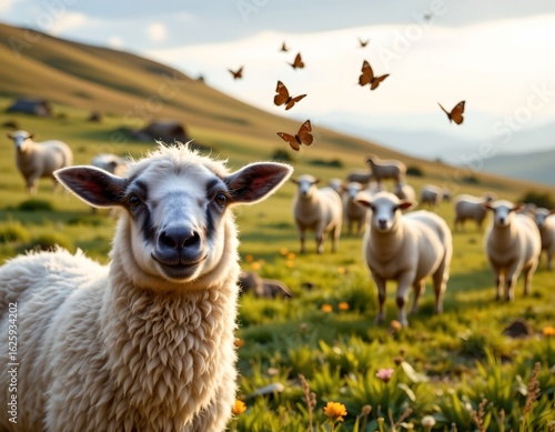 © CRISPIFLY, Fototapeta premium Serene Pastoral Scene with Alert Sheep and Butterflies