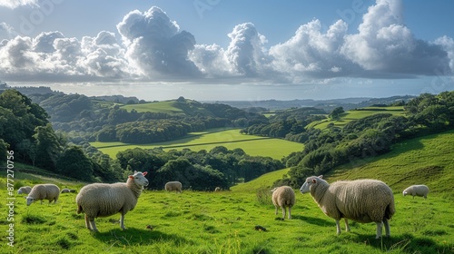 Fototapeta premium Serene Pastoral Scene with Grazing Sheep on Lush Green Landscape Under Partly...