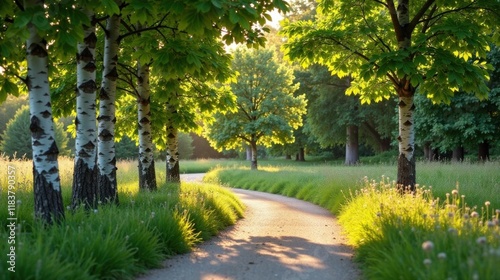 © parichart, Obraz premium Serene Path Through a Sun-Dappled Grove of Birch and Lush Green Meadows
