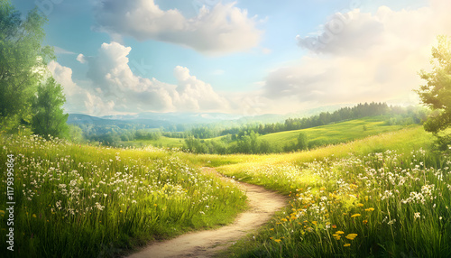 © Halfjoy, Fototapeta premium Serene Path Through Blooming Wildflower Meadow And Hills
